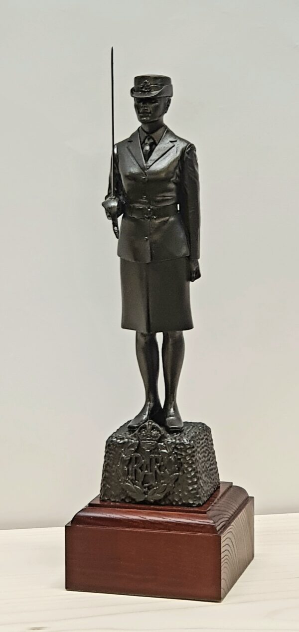 Cold cast bronze resin model, on wooden base, depicting a female RAF Regiment Officer with Ceremonial Sword.