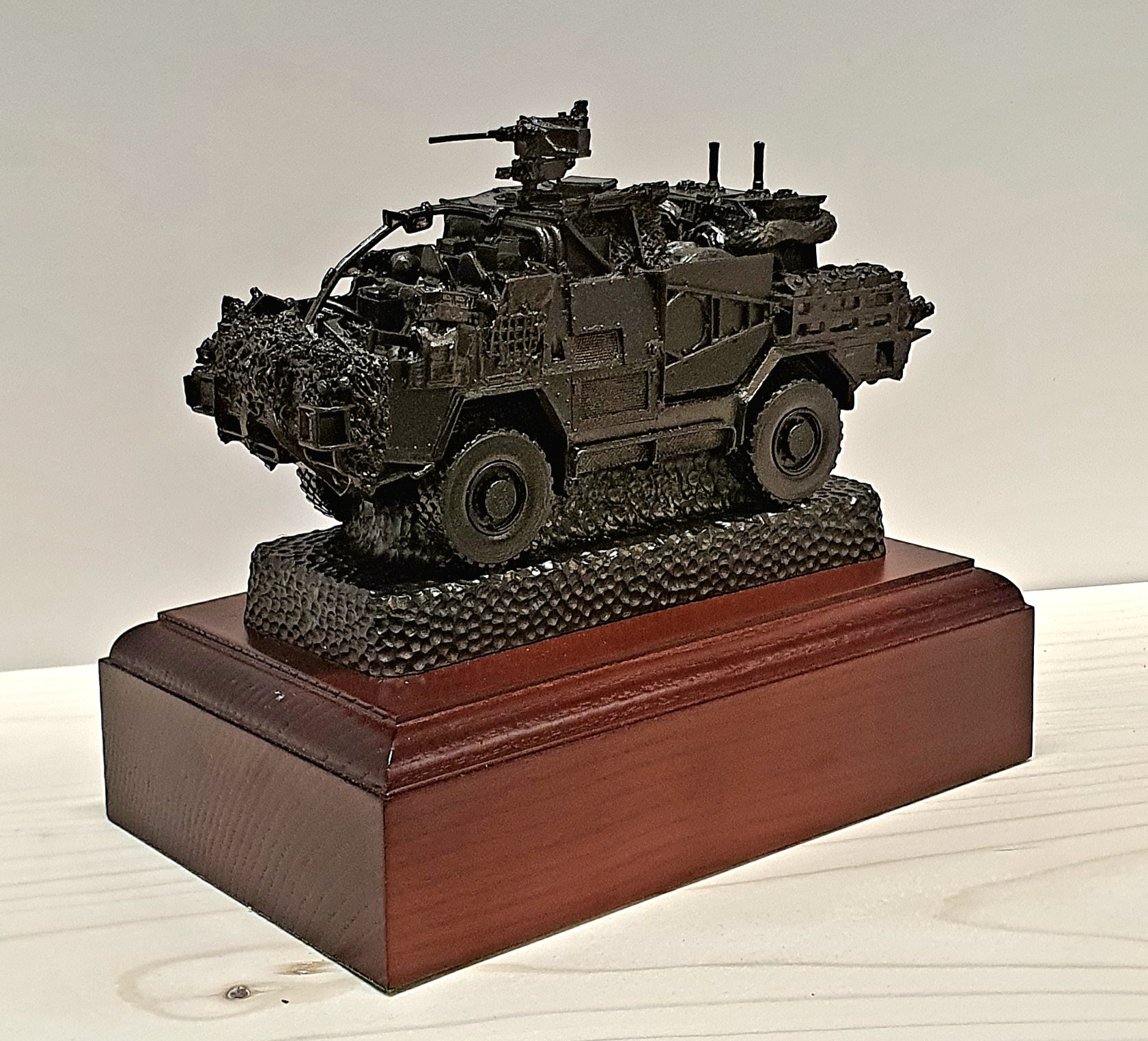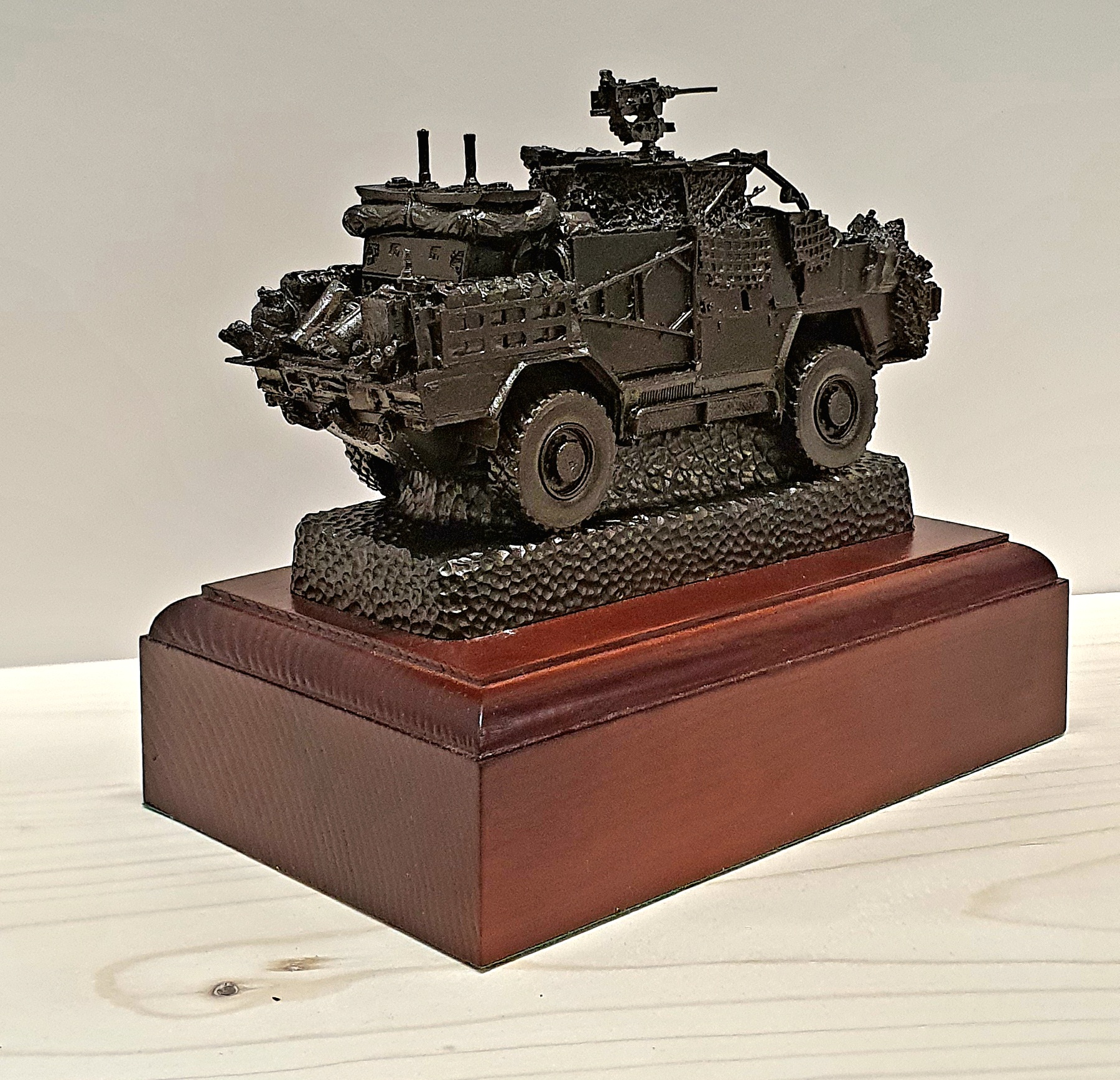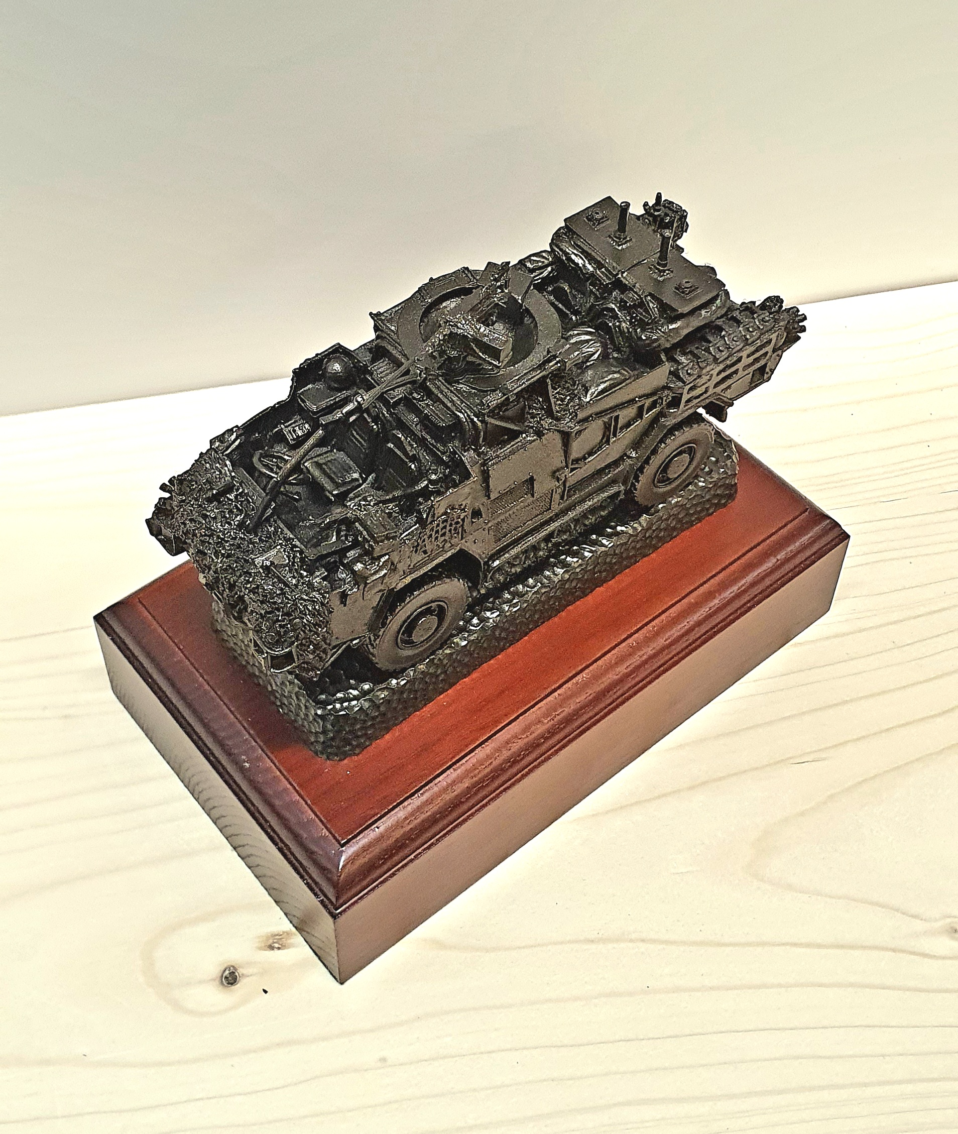 Cold cast bronze resin model, on wooden base, depicting a Jackal MWMIK.