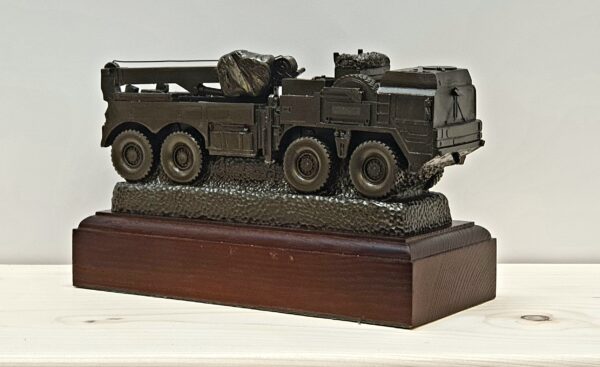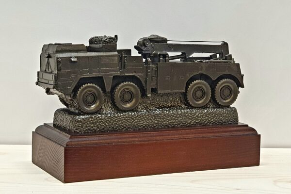 Highly detailed Cold cast bronze resin model, on rectangle wooden base, The MAN SV Recovery (IMM) 8×8 features the EKA Ltd Super Compact Recovery System incorporating an Atlas 600.2M1 recovery crane, Rotzler TR200/5 main winch, Rotzler HZ010 auxiliary winch and Rotzler TR080/5 self-recovery winch vehicle